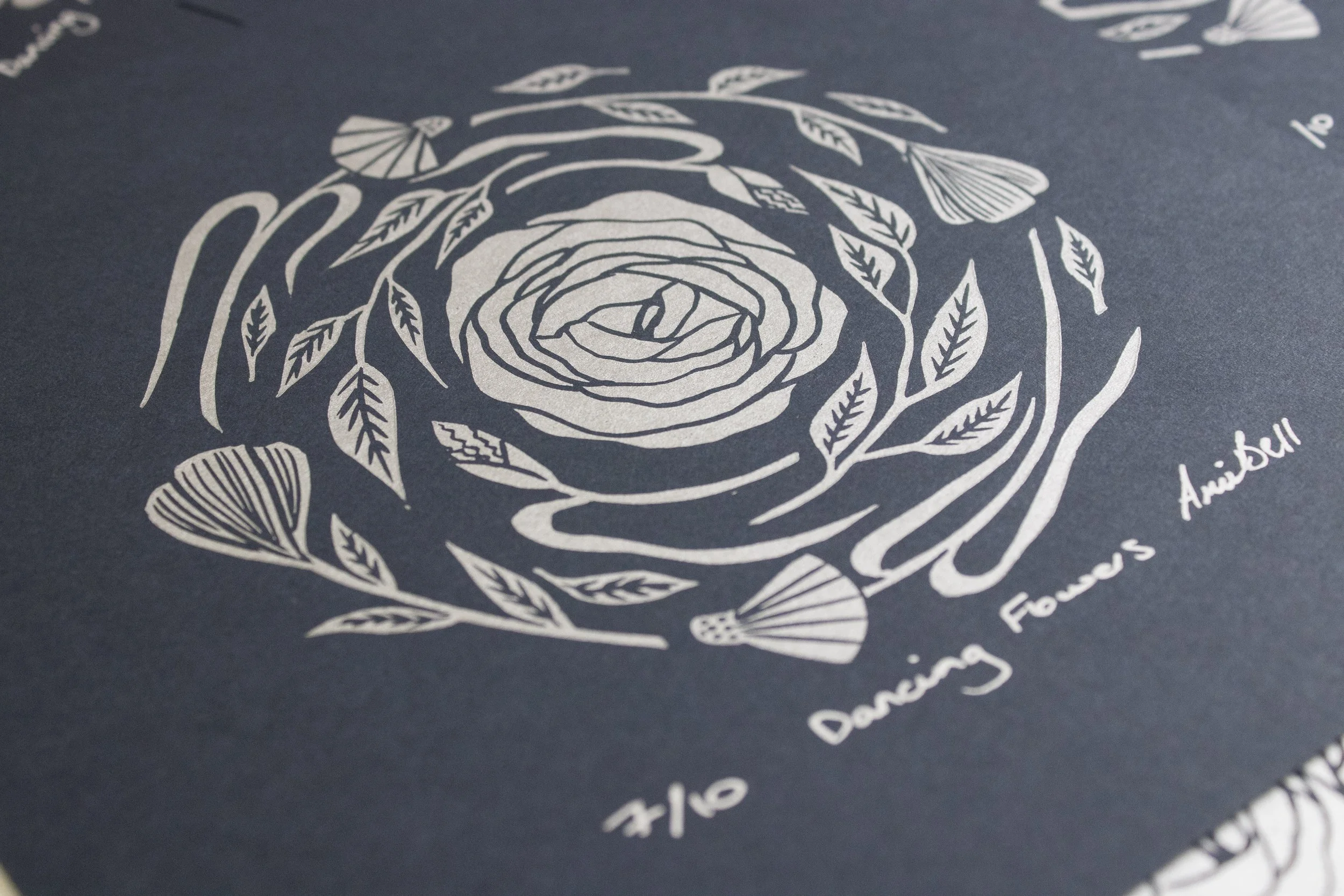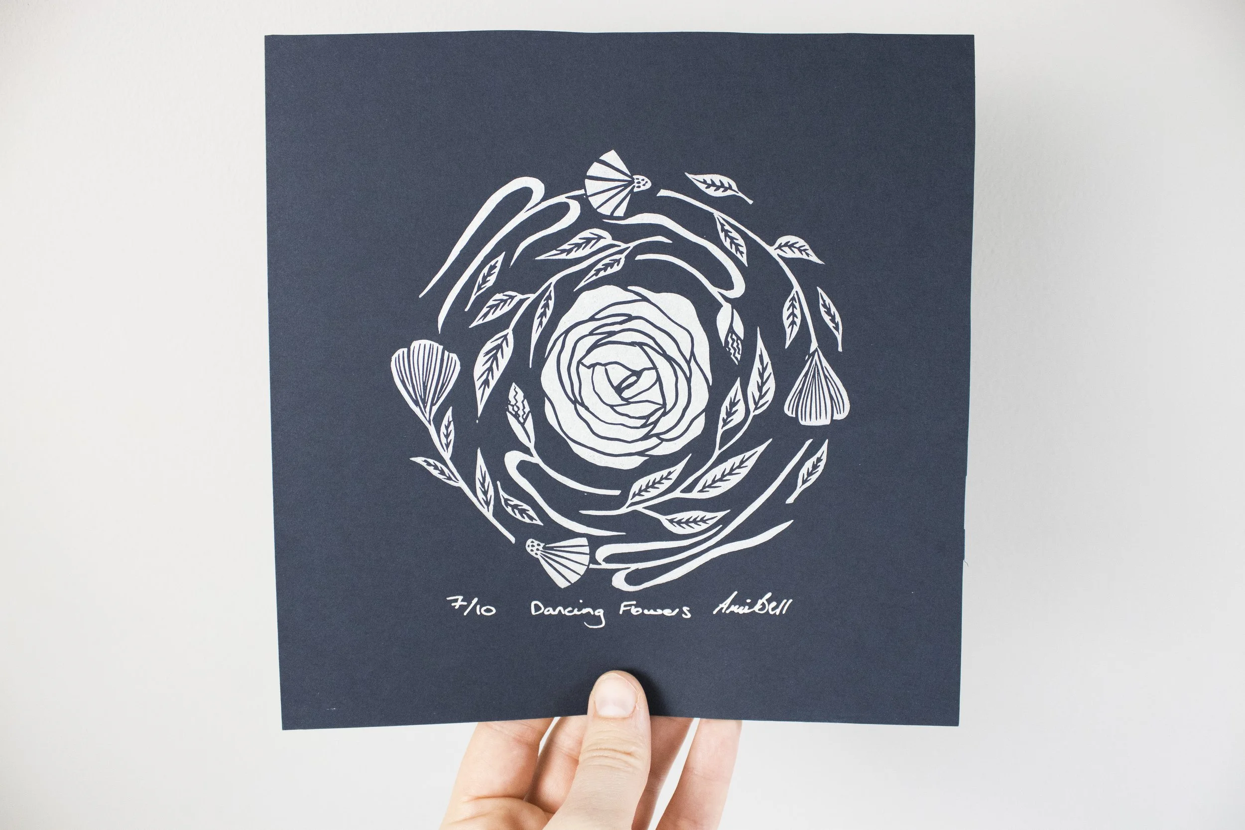 This original lino print features a large round flower in the center with smaller flowers circling around it. This design has been printed on dark navy paper using Cranfield Colours silver ink and measures 20cm × 20cm square.