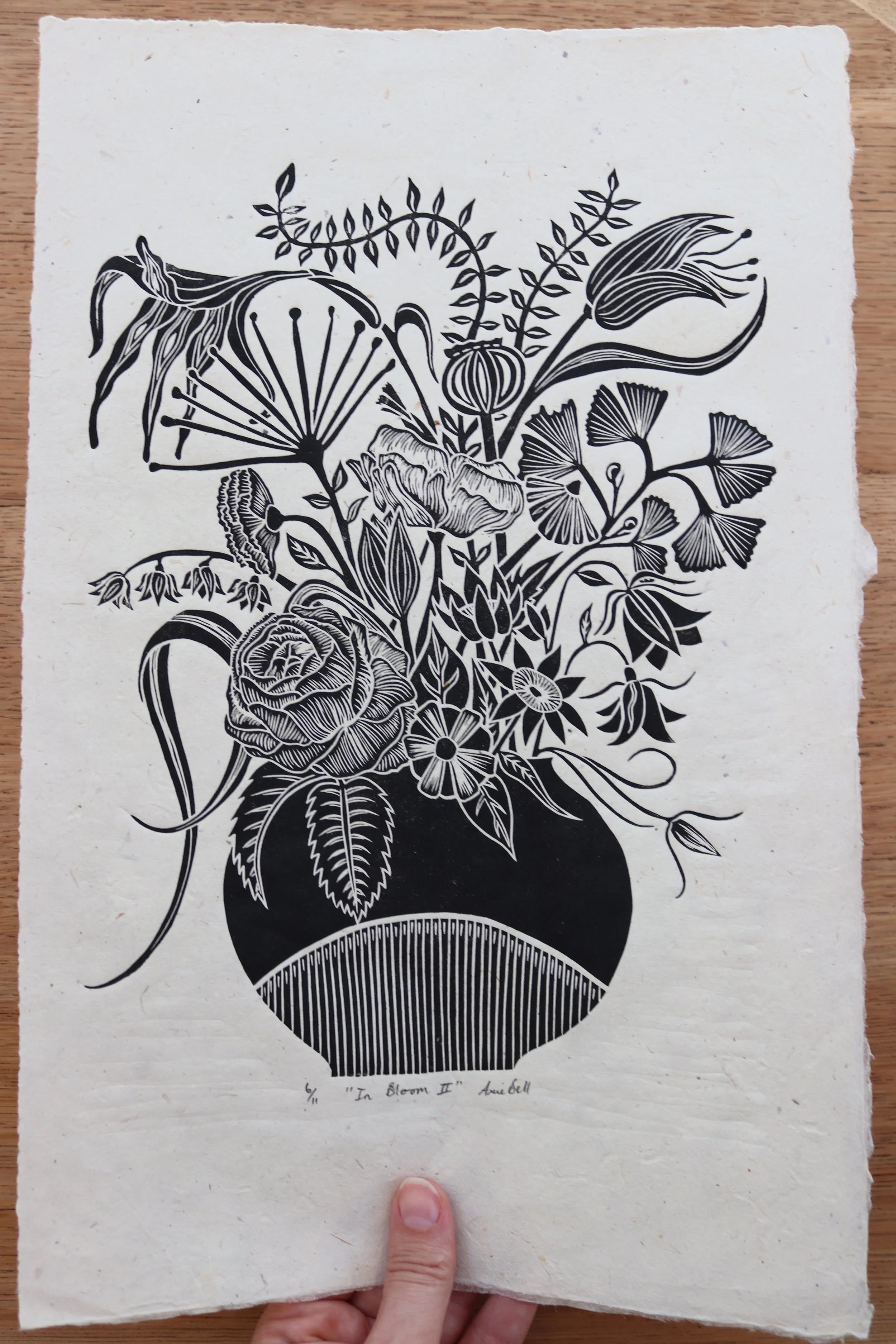 This original lino print features a round vase filled with an array of flowers in full bloom. Printed by hand in black Cranfield ink on beautiful handmade natural Lokta paper.