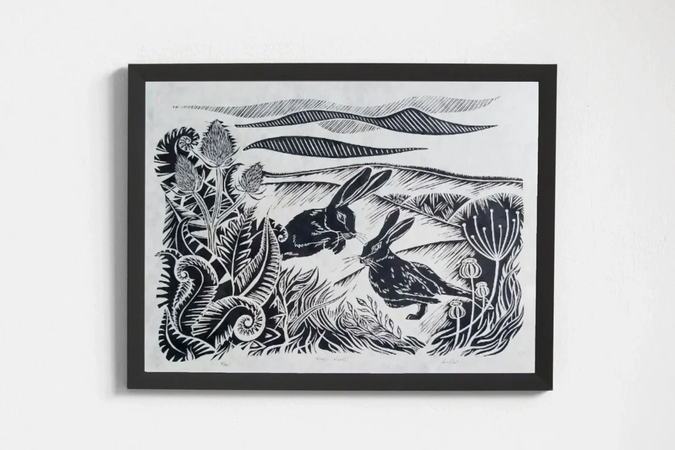 The scene features two hares leaping playfully from the hedges with rolling hills in the distance and drifting clouds above. This has been hand printed using Cranfield Colours black ink on 30gsm Natural Lokta paper. Paper size measures roughly 50cm x 37cm.